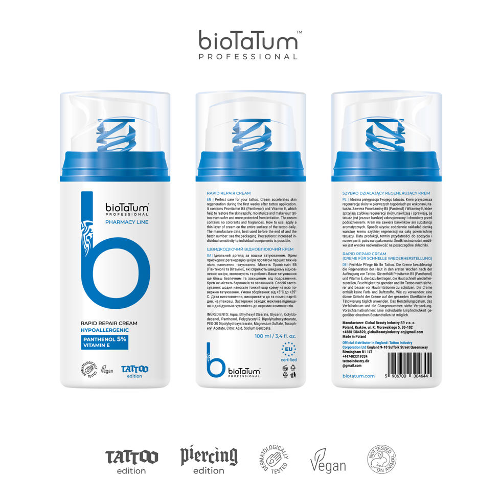 Rapid Repair ist eine intensiv regenerierende Creme aus der bioTaTum Pharmacy Linie, die speziell entwickelt wurde, um die Heilung der Haut in den ersten Wochen nach dem Tätowieren zu beschleunigen.